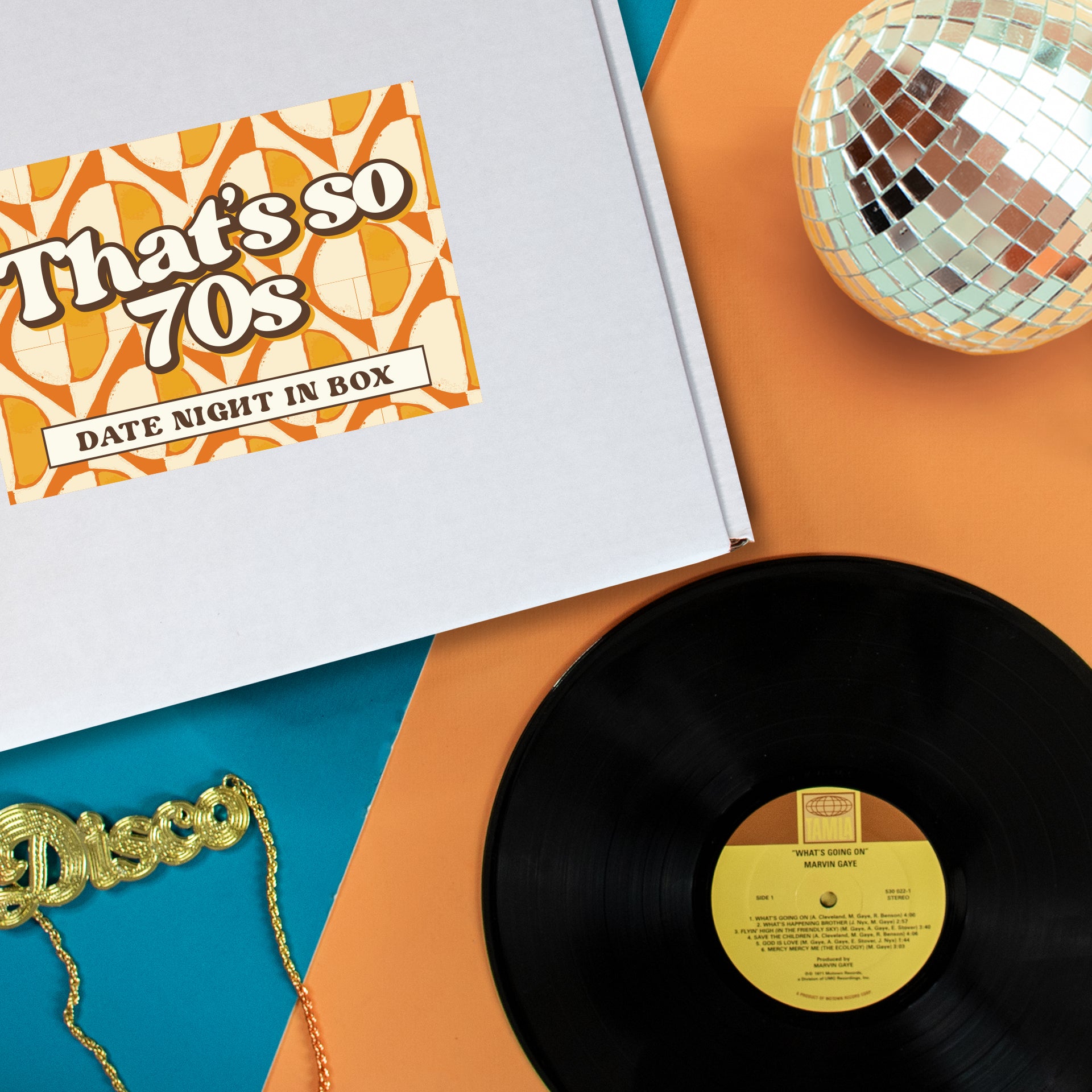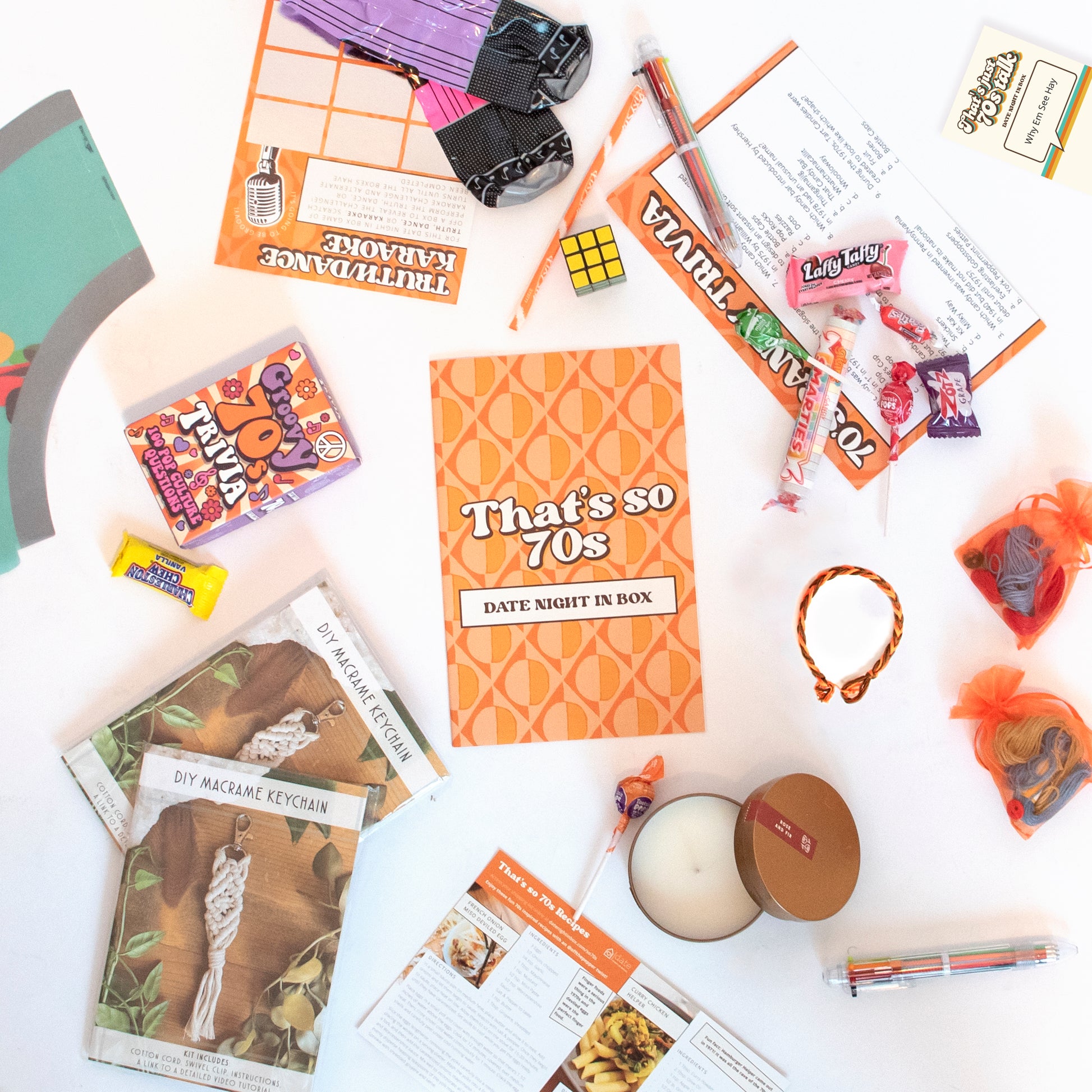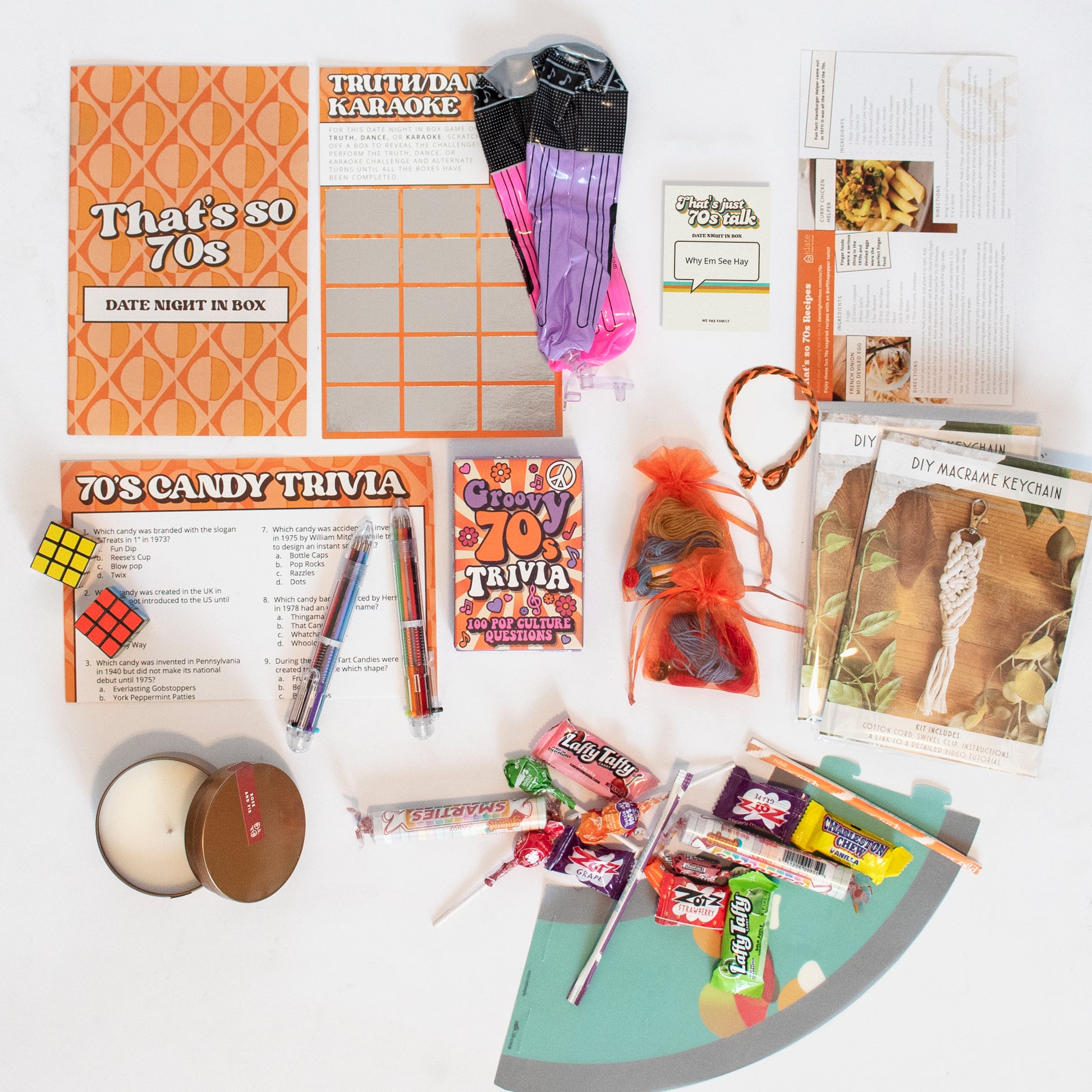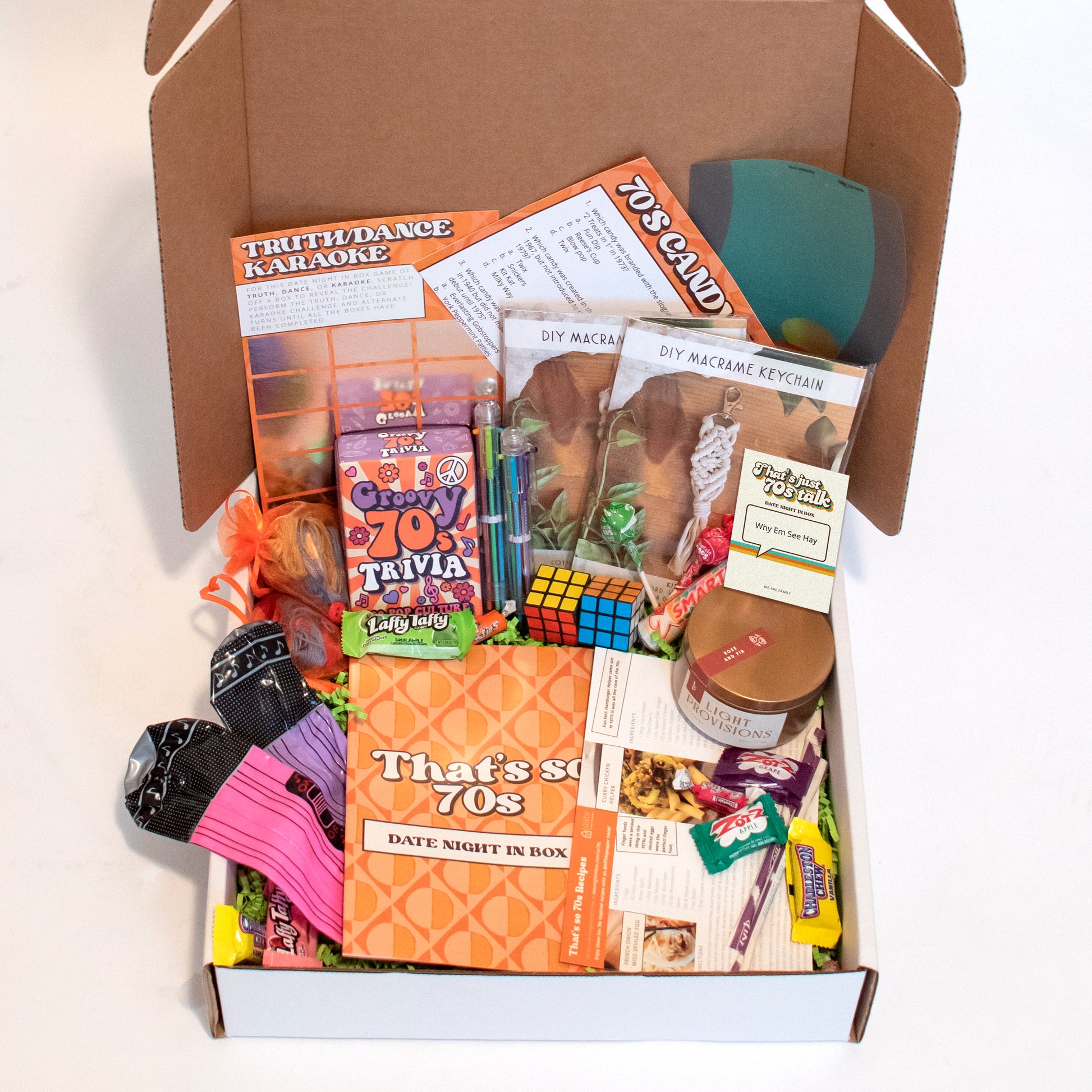 Travel back in time for a groovy night with the “That’s So 70s” PREMIUM Date Night In Box. Designed for couples who love nostalgia and fun, this themed experience is packed with interactive activities, DIY kits, games, and ambiance enhancers that capture the spirit of the 1970s.
